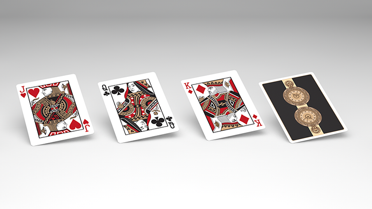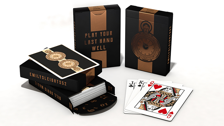 11th Hour Playing Cards contain mostly standard Bicycle faces on classic card stock with air cushion finish. All colors have been changed to a classy deeper red and a beautiful bronze that compliments the velvet-soft black vellum tuck featuring bronze foil inside and out. Card backs feature a custom back design with traditional thick borders and a hidden one-way back design indicated by a dark marking in one of the crowns. 55 of the card backs are fully marked including the duplicate 9 of Clubs, custom Ace of Spades and both unique custom reveal Jokers. All custom courts feature pocket watches (by Daniel Schneider)! The deck also includes a 2-sided ad card featuring the designers and explaining the marking system.