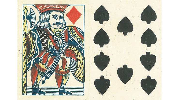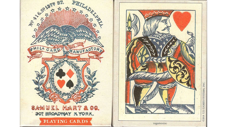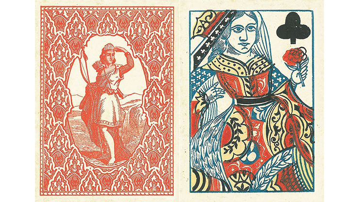 Authentic reproduction of an 1858 playing card deck by Samuel Hart & Co. with full-length, single-ended court figures, square corners and an unusual pictorial back design featuring a huntress peering across the landscape. Deck comprises 52 cards plus a conventional extra Ace of Spades and two information cards.