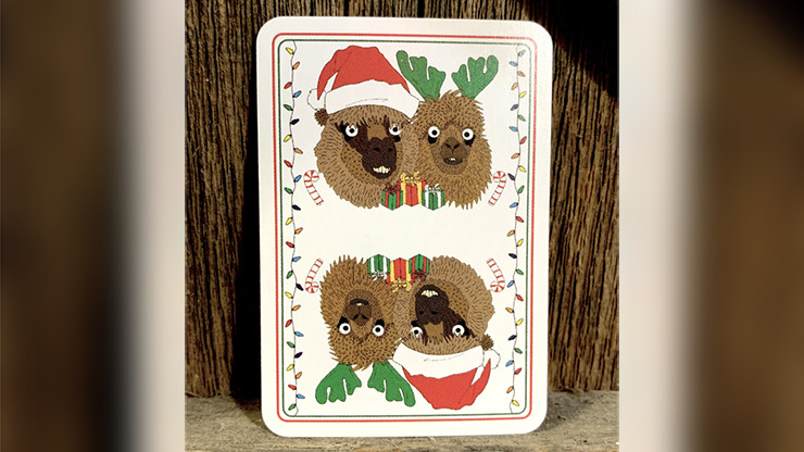 The Christmas and Kid’s Sized Christmas decks have been redesigned to bring you some fluffy holiday fun. The alpacas are adorned with antlers, hats, scarfs, cookies, candy canes and holly. The suits for these are the following: presents (Hearts), Christmas trees (Clubs), snowflakes (Diamonds) and snow/ice on the Spades. The main pips on the numbered cards of the Kid’s deck have been removed so your kiddos can get a better look at the animals! On the jokers you’ll find a cheeky alpaca spitting your way. Ba Humbug!