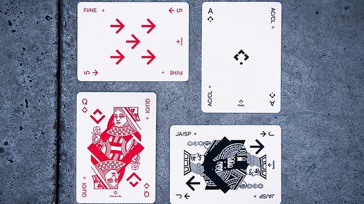 Luke Wadey’s new collection takes inspiration from street signage and Swiss graphic design to create decks that are truly original in their approach and execution. Focusing on direction, the first deck, V1, is fully custom including all the pips being made from arrows, monotone Court cards and unique Jokers.