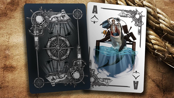 A monochromatic mirrored design of nautical elements adorns the back of these cards. Centralized around a stylized compass, a ship sails the sea with hungry sharks lingering beneath the vessel. A skull against the ship’s wheels warns of the catastrophic dangers of the water.