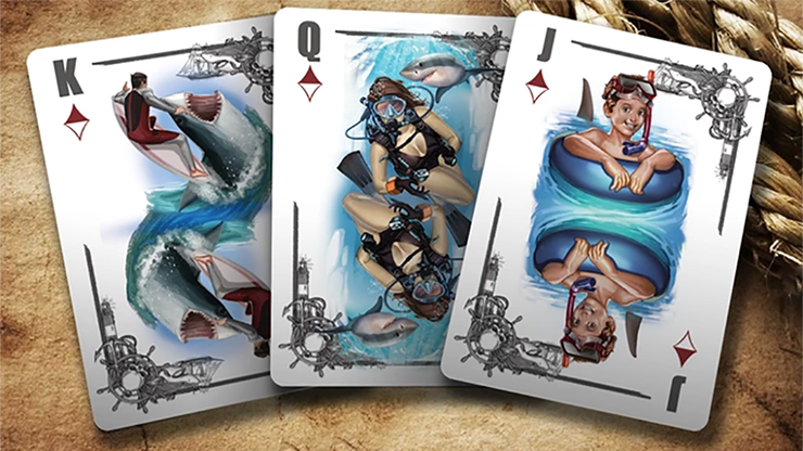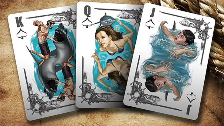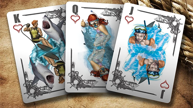 Riveting encounters of unknowing humans and menacing sharks are exposed in this venturesome deck. Hand-illustrated images of each face card highlight the detailed beauty of humankind and the inherent nature of the wild beast. Do you have what it takes to stay afloat or will the game pull you down under?
