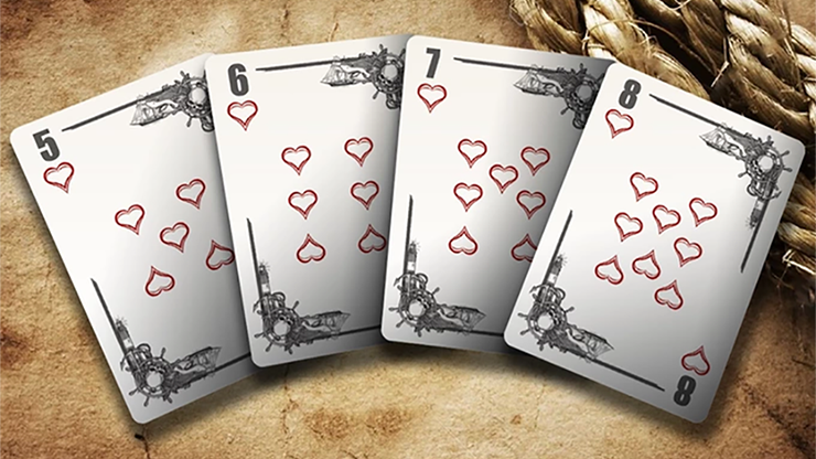 The borders of the cards are secured with a ship’s wheel and lighthouse to steer you in the right direction on your journey. A skull of an unfortunate seaman watches over your hand as a reminder of the dangers of the sea and of careless plays.