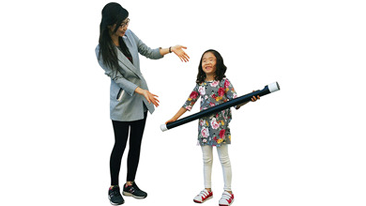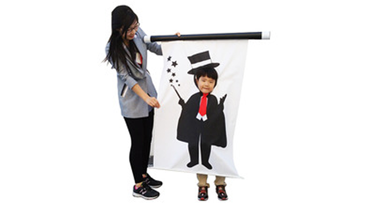 The magician holds the wand and shows to all the kids that this is only wand he/she call, a volunteer kid comes up to the stage and stand in front of the crowd, once the magician releases the lock of the wand, the banner will go down and the magician show up and fit the kids face.- Very fun- Easy to do