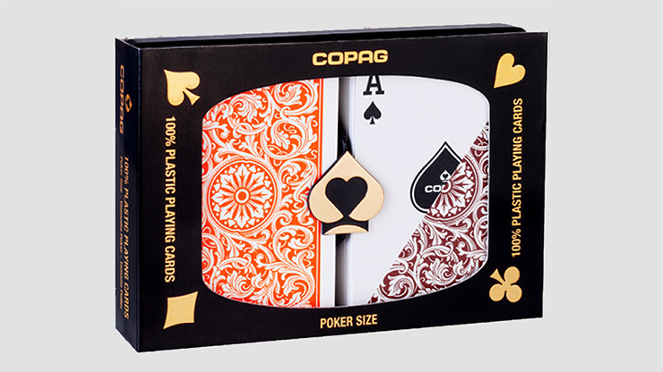 These two regulation-poker size decks measure 2 1/2 -by- 3 7/16 (W x H), and are made of practically indestructible PVC plastic material for years of use. Completely washable via a quick wipe with a damp cloth, the cards won’t soil over time. The decks come complete with a hard plastic storage and carrying case. Each deck includes 52 cards, 2 Jokers and 1 guarantee card.