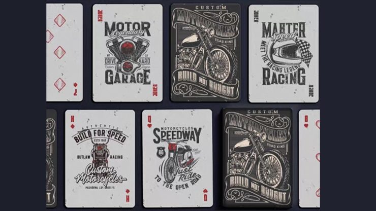 Custom Motorcycles Playing Cards feature various motorcycle-themed designs, including “Road King,” “Speedway Motorcycles,” and “Motor Legendary Garage” graphics.