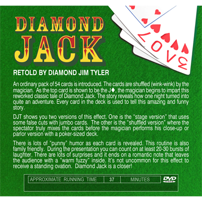 An ordinary pack of cards is introduced. The cards are shuffled (wink-wink) by the magician. As the top card is shown to be the Jack of Diamonds the magician begins to impart this reworked classic tale of Diamond Jack. The story reveals how one night turned into quite an adventure. Every card in the deck is used to tell this amazing and funny story.