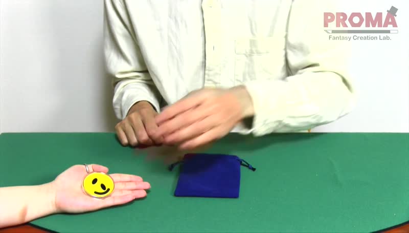 Facial parts shaped Inside a round case. Each time shaken the case, the parts move, randomly changing the face. Hand the case to the audience and have them shake it as much as they like without looking at the face. After confirming the completed face, turn over the drawstring pouch on the table-and lo and behold, that exact face is clearly printed on the pouch! You can then hand all the props directly to the audience for checking.
