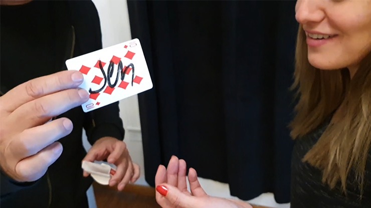 You ask the spectator to choose and sign any card in the deck. Then you loose it in the deck, the cards are mixed. Suddenly the cards in your hands are transformed into a box. When you open the box you can see that all the cards appears into the box, and then with a magic puff all cards disappear, all except by one their signed selection!