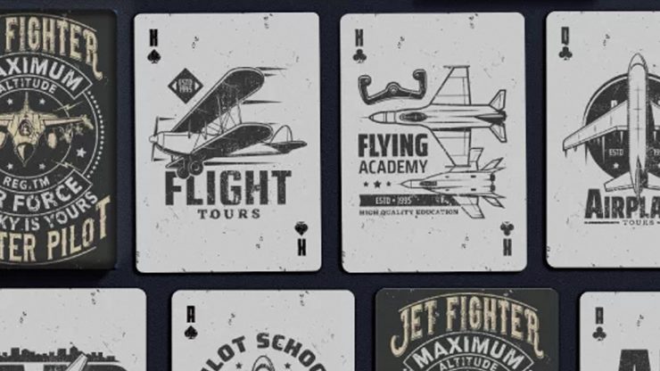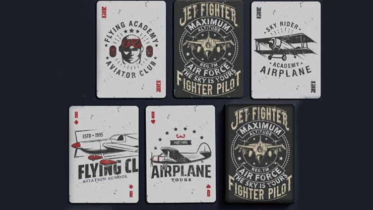 Jet Fighter Playing Cards feature a vintage-style Aviation-themed design celebrating aviation and fighter pilots, with the slogan “The Sky Is Yours”, “Fighter Pilot” on the tuck box. The Joker card in the deck also follows this theme, displaying a “Flying Academy Aviator Club” design.