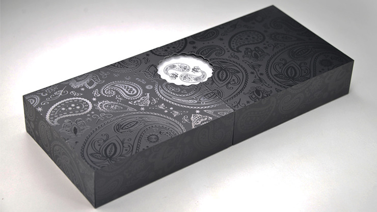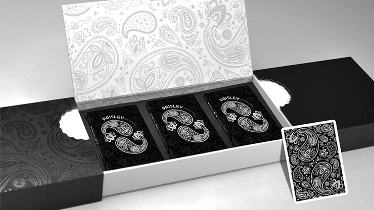The black and white Paisley Collector’s Box with 3 black Paisley worker’s decks, from the Dutch Card House Company.