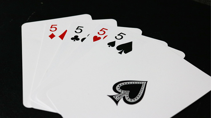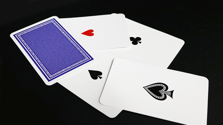Four mini jumbo blank paying cards are shown. With a simple twist they will turn into four aces and finally into four Fives’.