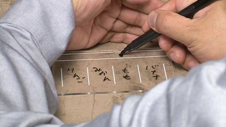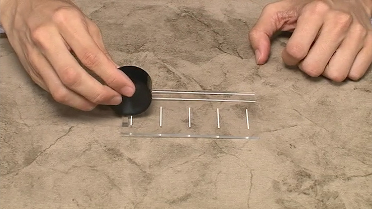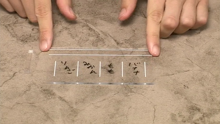 The magician displays a transparent board with four different fruits written on its surface. A spectator is invited to select one of the fruits, and hide that selection from view. The transparent board is tilted up to form a ramp. The magician places a black cylinder at the top of the ramp, and it slowly rolls downward. However, the cylinder mysteriously stops when it reaches the selected fruit!
