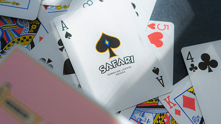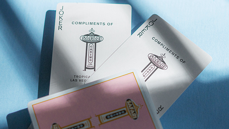 Pink Safari Casino playing cards featuring vintage design inspired by old Las Vegas casino decks such as Dunes Casino playing cards. Safari backs showcase a beautiful slim tower decorated with complementary colors.