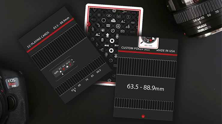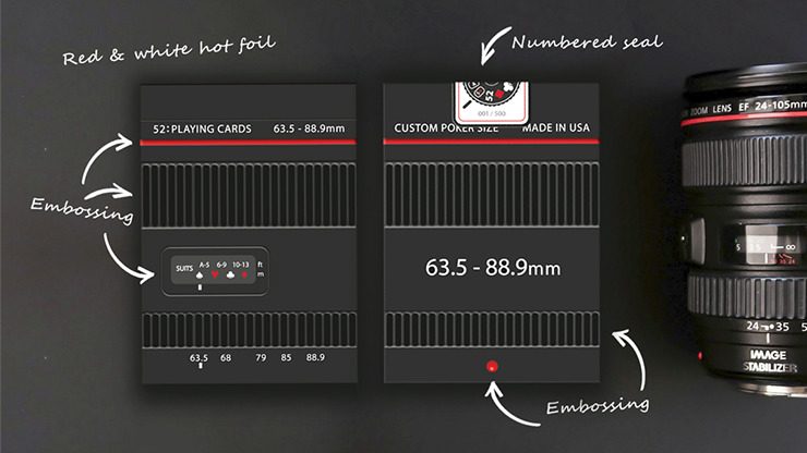 The tuck was designed to mimic the aesthetics of a DSLR camera lens (a.k.a “Glass”) while displaying information more related to playing cards. The red ring around the tuck mimics a professional line of lenses, known as Red Rings, which are classified as a higher grade of glass. This deck was created to spark the urge for shooters to get out and shoot.
