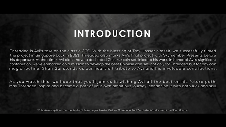 With the blessing of Troy Hosser himself, we successfully filmed the project in Singapore back in 2021. Threaded also marks Avi’s final project with Skymember Presents before his departure. At that time, Avi didn’t have a dedicated Chinese coin set linked to his work. In honor of Avi’s significant contribution, we’ve embarked on a mission to develop the best Chinese coin set, not only for Threaded but for any coin magic routine. Shan Gui stands as our heartfelt tribute to Avi and his invaluable contributions.