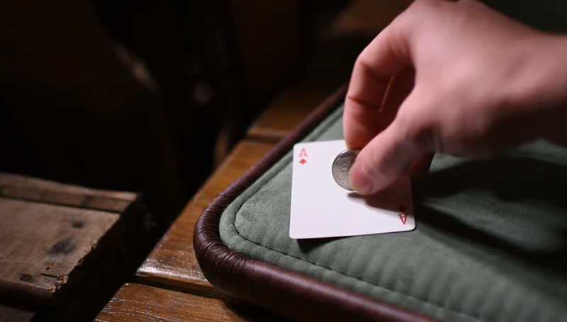 The magician gives the spectator some coins to choose from and to also sign one. The spectator then closes their hand around all the coins and knocks on the waiting deck of cards.
