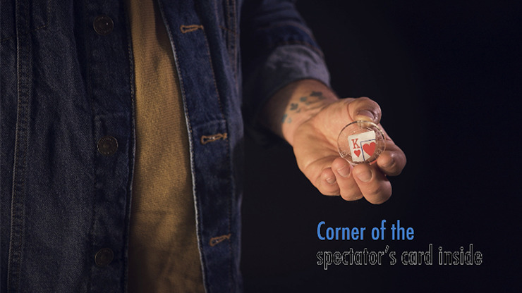 The spectator choses a card, loses it in the deck and the magician asks him to imagine himself tearing or cutting a corner of his card and throwing it in the air, then you show the poker chip on your hand and pretend to catch the corner in the air and put it in the poker chip but we can’t see it inside so you propose to fix that with magic so you wave your hand above the poker chip and it becomes clear with the corner of his card stuck inside , you go inside the deck and indeed on his card it lacks the corner, moreover it matches with the corner inside the clear poker chip.
