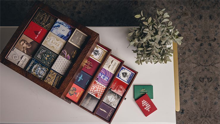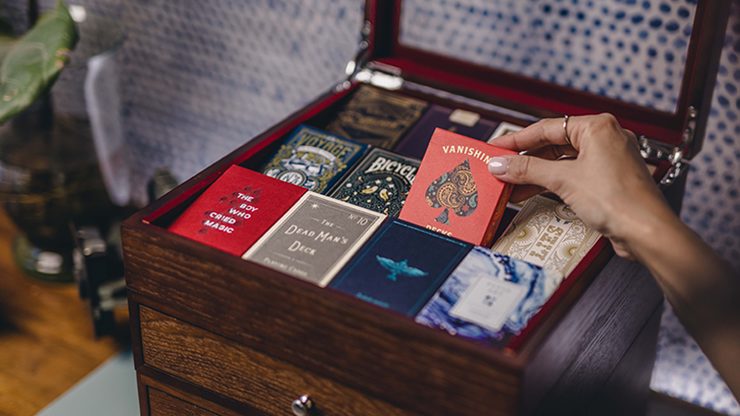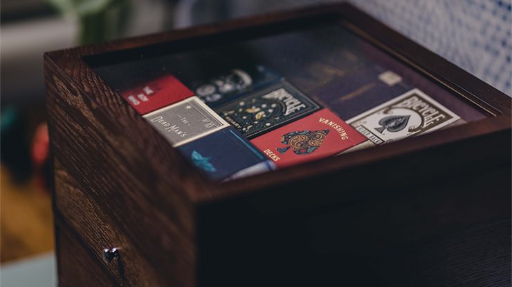 Constructed of high-quality wood and featuring a wide acrylic viewing top, “Vxc3xa9lo Clear” is the perfect way to showcase 12 of your favorite decks while also protecting them from dirt and dust. Each one includes a removable soft insert that rests the tuck boxes at the perfect angle for highlighting their most elaborate details, while also giving you quick and easy access to your cards whenever the top is open.
