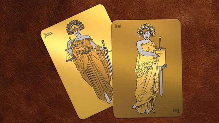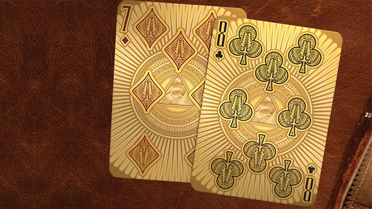 The gilded editions feature the same details as the standard editions, but with the addition of brilliant coordinating gilding to the edges of the decks. The gilded edition also features a unique die-cut tuck case, showcasing the all-seeing eye on the deck.